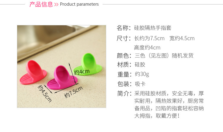 隔热夹,安全无毒,抗老化,抗腐蚀,经久耐用。 握手部分贴心设计,使用简单。材质柔软,任意弯曲不变形。高效耐热,有效防烫。 防滑纹路设计,有效防止餐具时滑落的现象。
