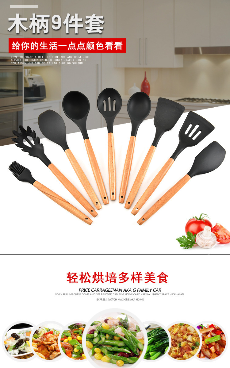 名称:木柄9件套硅胶厨具,硅胶厨具九件套木柄