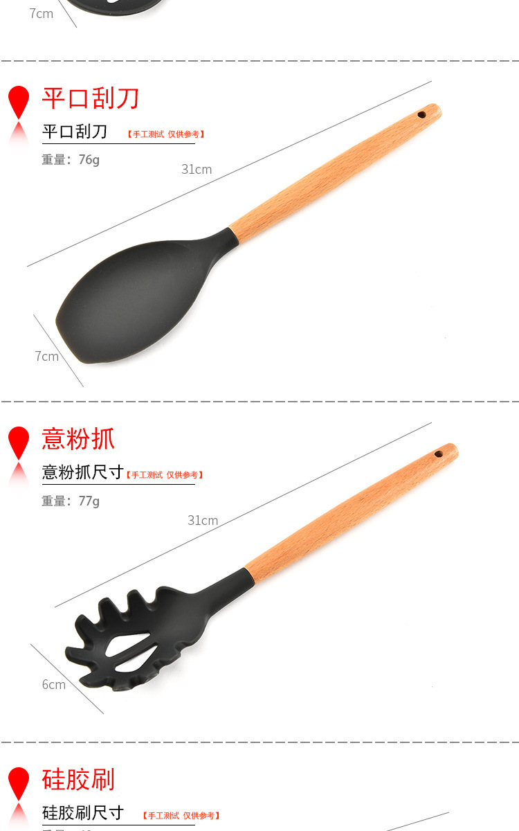 明细:汤勺、漏铲、漏勺、平口刮刀、意粉抓、硅胶刷、刮刀、密铲、密勺